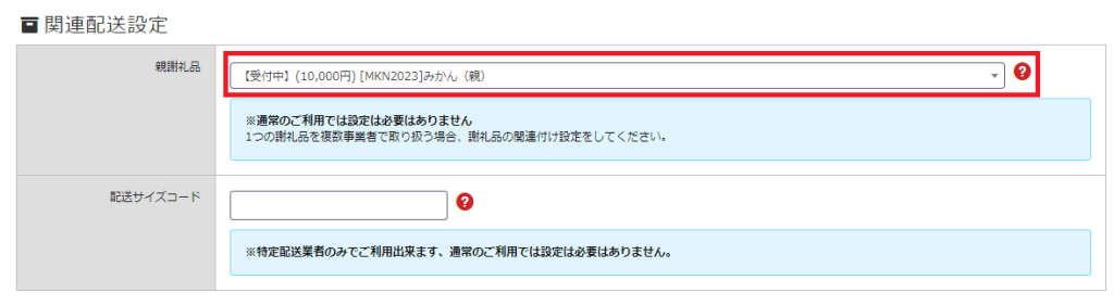 ③ 編集画面内「関連配送設定」の「親謝礼品」へ、事前に登録しておいた「MKN2023」を設定します。