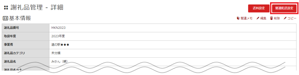 ④ 親謝礼品に設定された謝礼品の「詳細」へ入ると、「関連配送設定」のボタンが表示されていることが確認できます。以上で「関連配送設定」の事前設定は完了です。