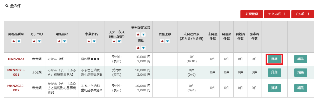 ② 謝礼品番号「MKN2023-001」「MKN2023-002」について、それぞれ「編集」を開きます。