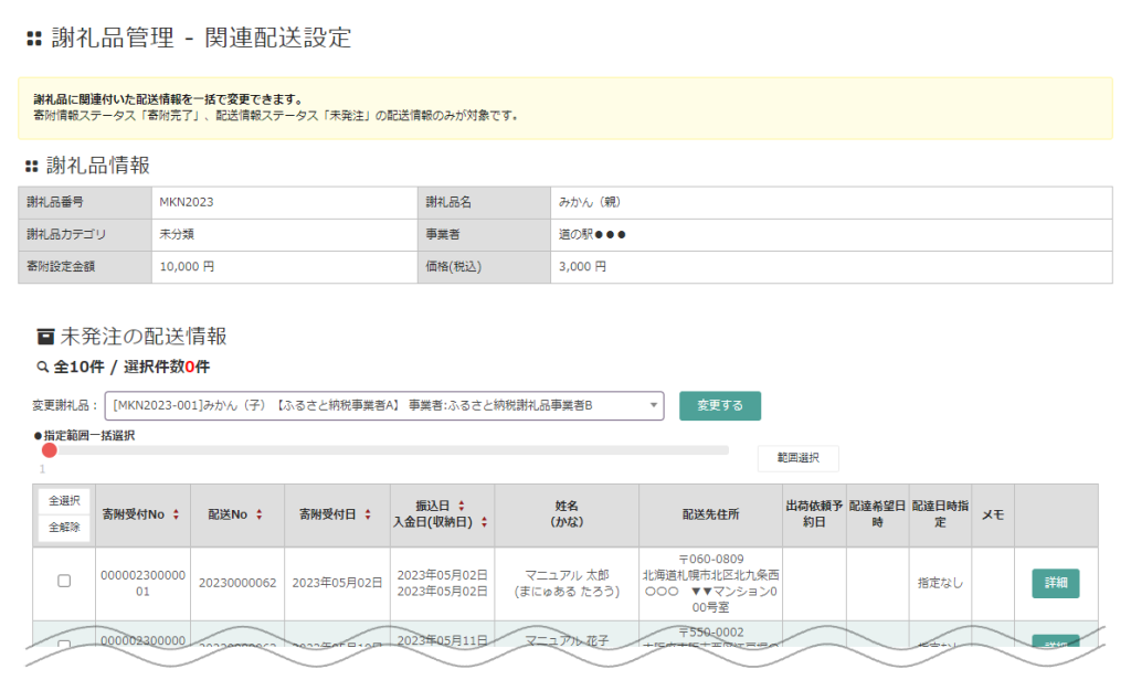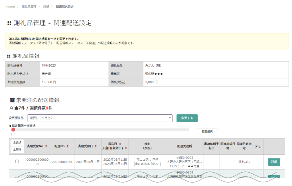 振り分け可能な配送情報は、寄附ステータス「寄附完了」/ 配送ステータス「未発注」の配送情報のみです。関連配送設定を行っている謝礼品は「出荷依頼」へ更新する前に、配送情報の振り分けを行ってください。