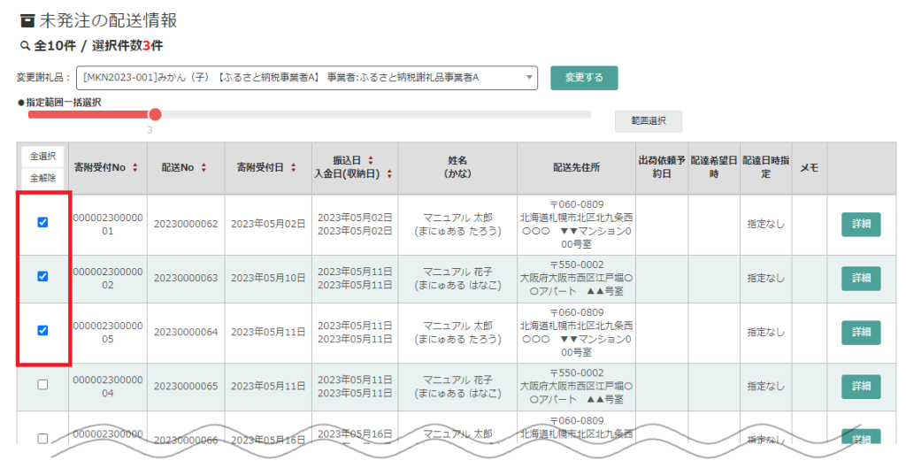 上から何件の配送情報を選択するかスライドし、「範囲選択」ボタンをクリックすると指定した件数分配送情報を一括で選択できます。