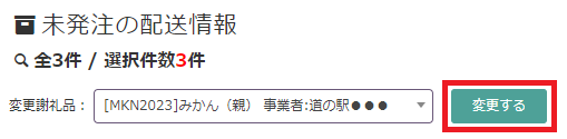 ④ 未発注の配送情報の「変更謝礼品」で、振り分け先の謝礼品を選択します。