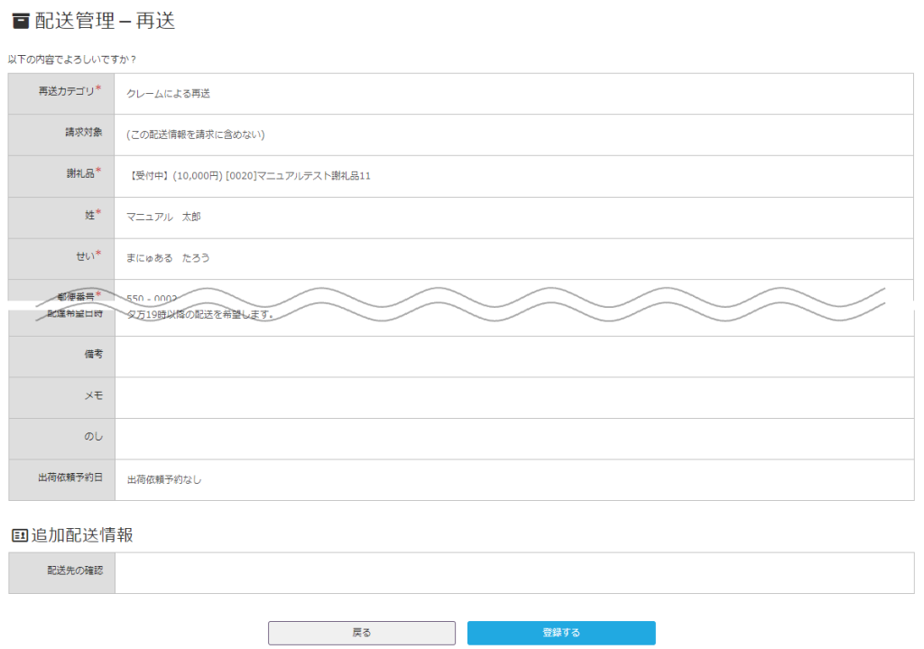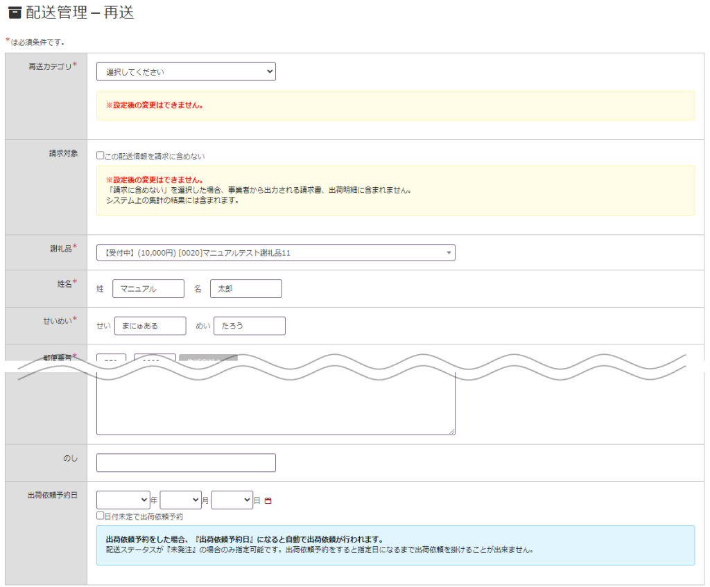 姓名配送先の名前を入力します。再送対象の配送情報で登録されていた姓名が入力されています。