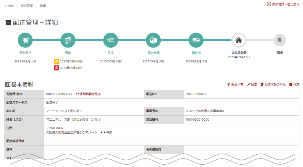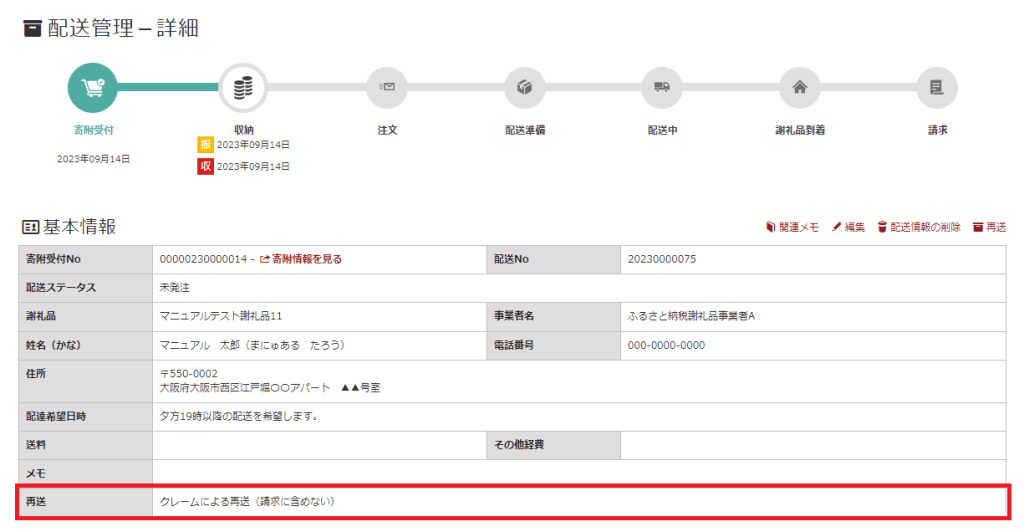 ② 寄附管理-詳細画面の「配送情報」に「再送」のマークと注意文が表示されます。