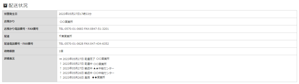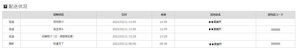 配送情報に登録されている伝票番号から、それぞれの配送業者の追跡サービスでの情報を参照したものを確認できます。「配送状況の取得」内に表示される項目は、配送業者ごとに異なります。