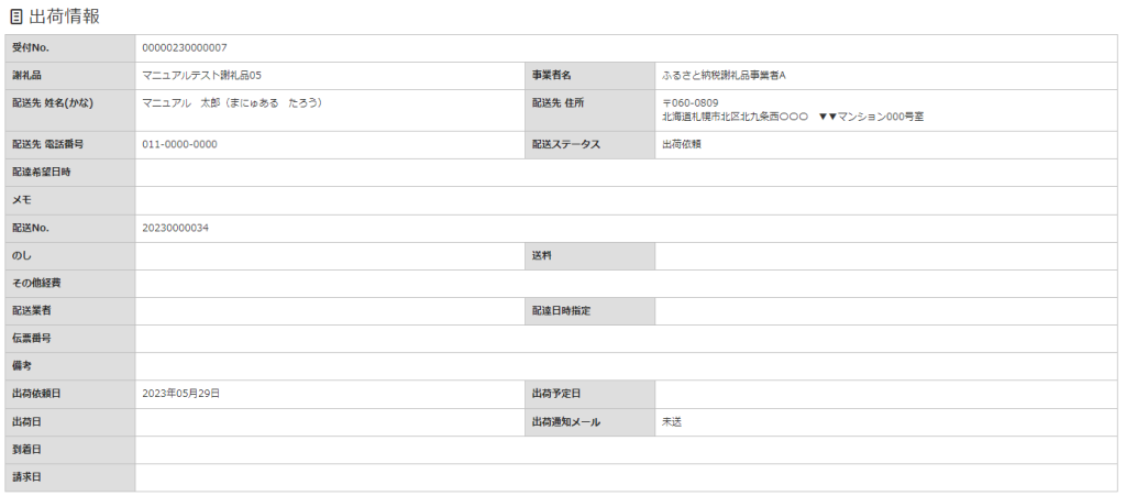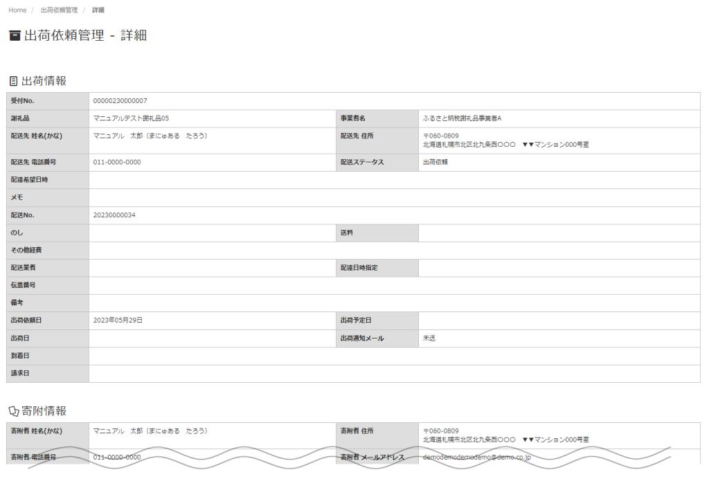 配送情報一覧の「詳細」ボタンをクリックすると、配送情報の詳細が表示されます。