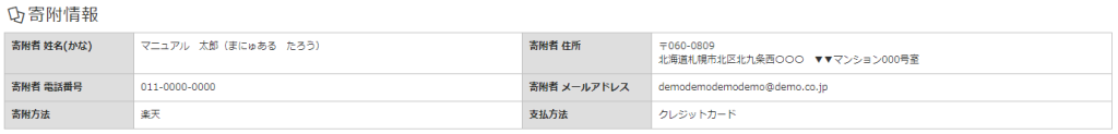 謝礼品寄附時に寄附者が選択した謝礼品です。(謝礼品管理で登録した「謝礼品名」が表示されます)