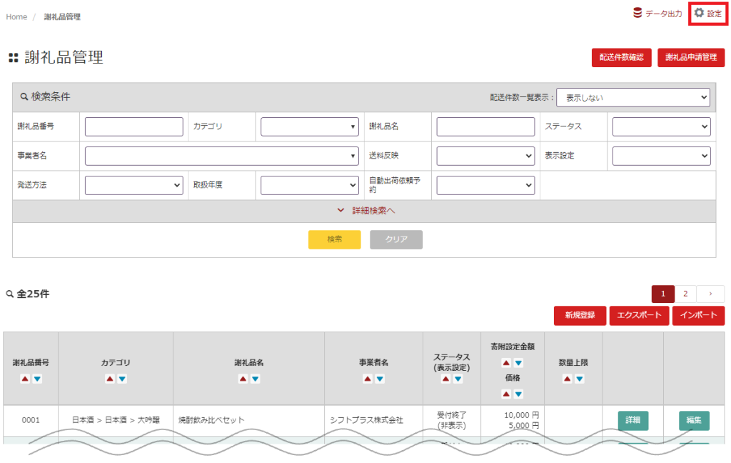 謝礼品管理にある歯車のボタンをクリックすると、都道府県別送料の一括登録・更新や謝礼品検索条件非表示等の設定ができます。