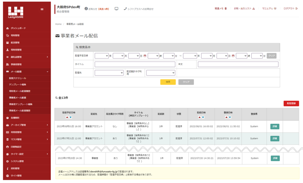 メニュー「事業者メール配信」に遷移すると、最初に登録済みのメール配信の一覧画面が表示されます。