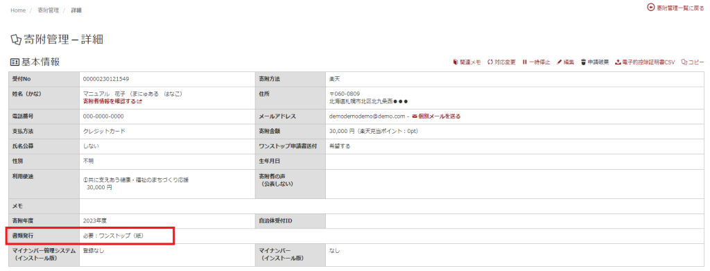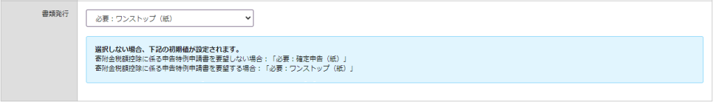 寄附管理「新規登録」や、「書類発行」が空欄で取込み済の寄附情報を編集する際、ワンストップ申請書送付「希望する/希望しない」に関わらず、「書類発行」は任意のステータスを登録いただけますが、「書類発行」を未選択で登録、編集を行った場合は、ワンストップ申請書送付「希望する/希望しない」に合わせて、「書類発行」へ「必要:ワンストップ(紙)/必要:確定申告(紙)」が登録されます。