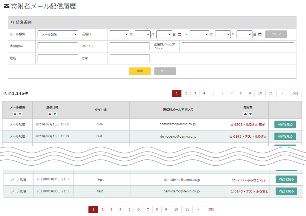 | 寄附者 | メールを送信した寄附者情報詳細画面へ遷移することができます。 |