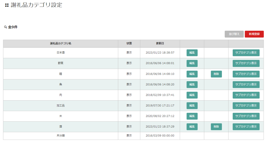 対象の謝礼品カテゴリのサブカテゴリを表示したり、新規登録することができます。