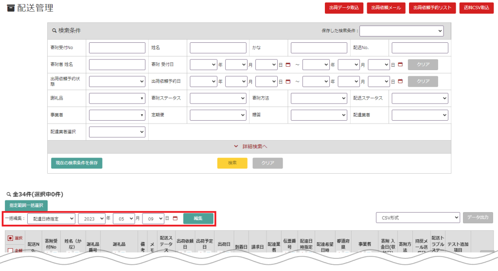 ② 一括編集で「配達日時指定」を選択の上、「編集」ボタンをクリックします。