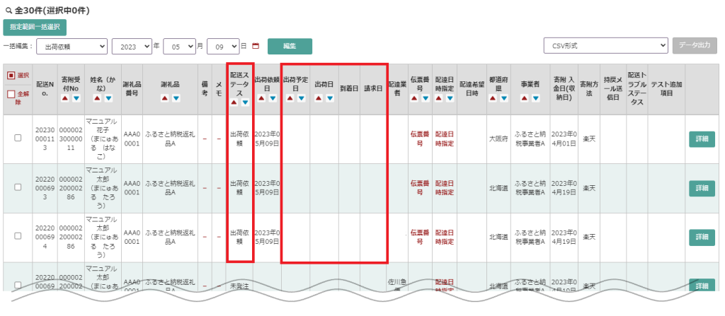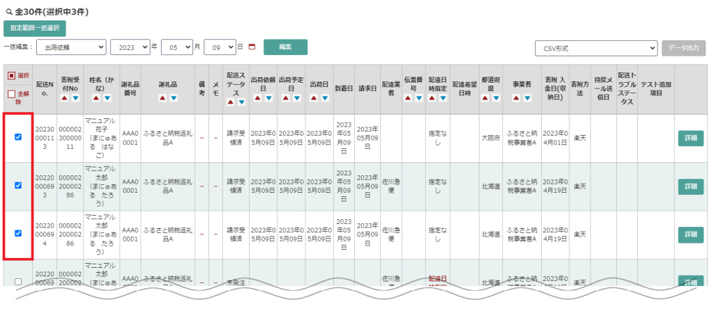 ※配送ステータス「請求受領済」→「出荷依頼」へ一括編集する場合※