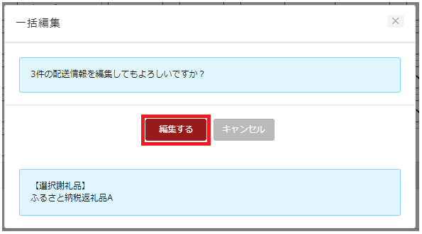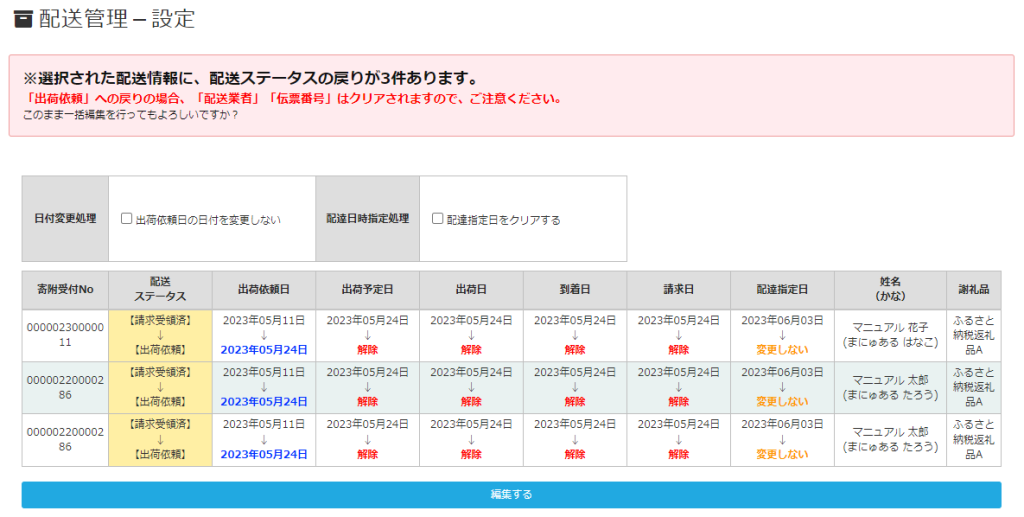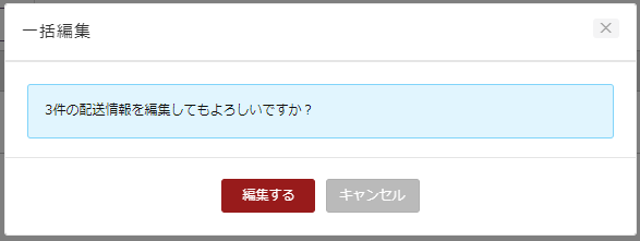 ② 一括編集で、変更後の配送ステータスと登録する日付を選択し、「編集」ボタンをクリックします。