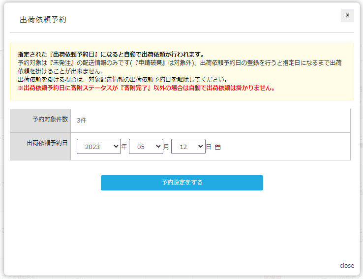 ④ 出荷依頼予約設定画面が表示されます。予約対象件数を確認し、件数に誤りがない場合は「予約設定をする」をクリックします。