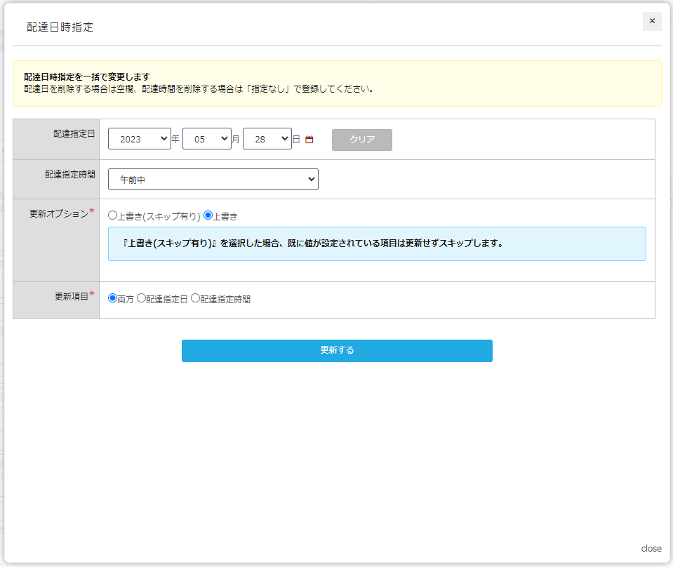 | 更新オプション | 既に配達日時指定が登録されている配送情報について、入力している内容で上書きしてもよいか、上書きせずスキップするか選択します。 |